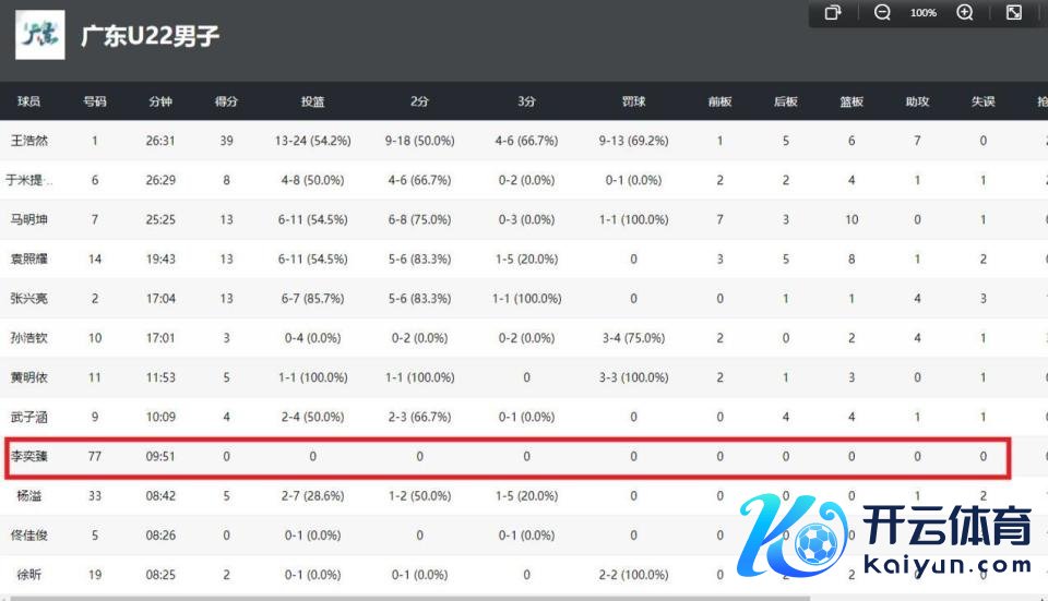 本场比赛广东U22男篮4东谈主得分上双,王浩然爆砍39分6篮板7助攻,马明坤13分10篮板,袁照射13分8篮板,张兴亮13分4助攻。反不雅出自广东宏远的几位球员推崇就一般了,徐昕得到2分2篮板,杨溢5分,黄明依5分。而李奕臻莫得任何数据,一谈为0。