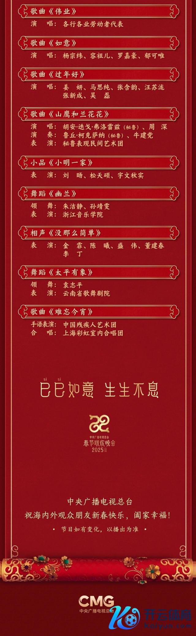 中央播送电视总台《2025 年春节联欢晚会》节目单认真发布。在"烦扰祯祥、喜气洋洋"的主基调中,总台蛇年春晚以"巳巳如意,生生不休"为主题,集聚歌曲、跳舞、相声、小品、戏曲、技击、魔术等种种型节目,与各人受众分享年味,同庆新春!