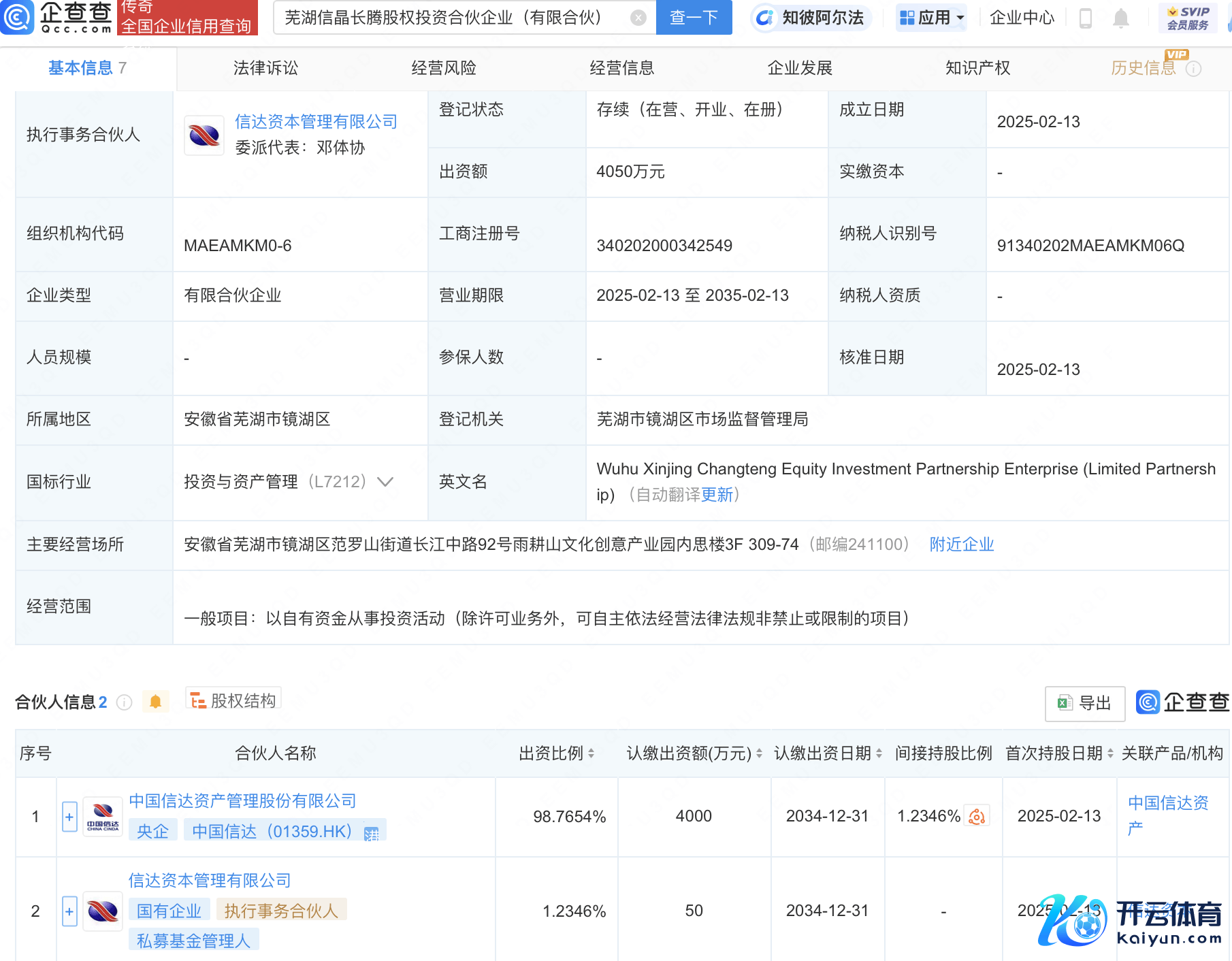 企查查APP清晰,近日,芜湖信晶长腾股权投资合资企业(有限合资)拓荒万博manbext体育官网app官网,出资额4050万元,贪图范畴包含:以自有资金从事投资举止。企查查股权穿透清晰,该企业由中国信达(01359.HK)等共同出资。